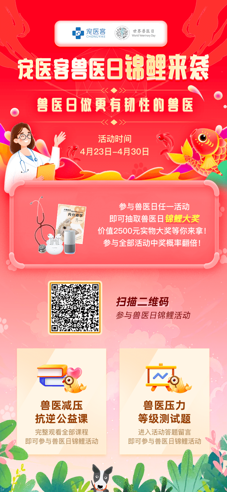 为庆祝第22个世界兽医日,响应中国兽医协会发布的《关于开展2022年世界兽医日主题活动的倡议》,宠医客今年继续开展了“兽医日锦鲤活动”。