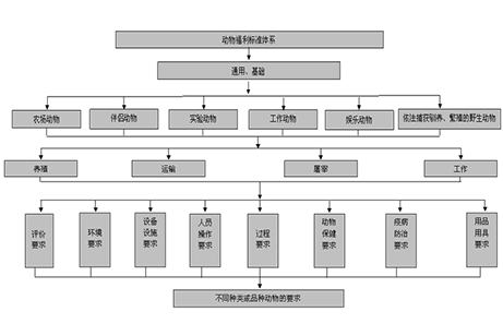 目前,我国相关部门和研究机构也正在积极制定有关动物福利的评价体系,如2011年5月启动的《动物福利评价通则》行业标准制定工作,目的旨在于建立评估动物福利状况的科学体系,从而提高动物福利水平。其主要内容包括:范围,规范性引用文件,术语和定义,动物福利评价基本原则,动物福利体系建立与运行,动物福利体系评价,附录动物福利评价体系框架图(见下图)。